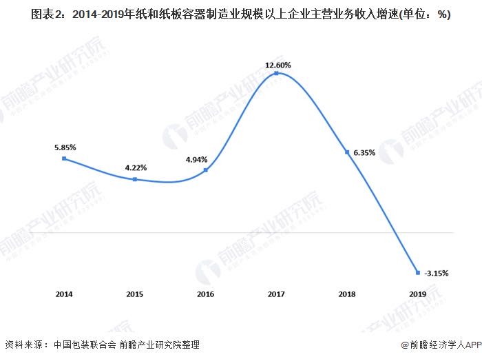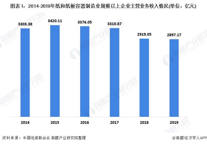 我國(guó)包裝行業(yè)的產(chǎn)品主要包括紙包裝、塑料包裝、金屬包裝、玻璃包裝、包裝機(jī)械。其中,紙包裝是包裝行業(yè)最重要的組成部分,在食品、藥品、家用電器、文化用品等領(lǐng)域廣泛應(yīng)用。2019年,紙和紙板容器制造業(yè)規(guī)模以上企業(yè)實(shí)現(xiàn)主營(yíng)業(yè)務(wù)收入2897.17億元,同比下降3.15%,這是行業(yè)六年來(lái)規(guī)模以上企業(yè)主營(yíng)業(yè)務(wù)收入首次出現(xiàn)下降。