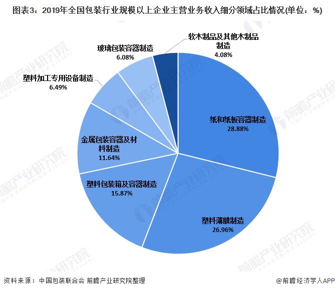 2019年在整個(gè)包裝行業(yè)中,紙和紙板容器制造業(yè)營(yíng)業(yè)收入占整個(gè)包裝產(chǎn)業(yè)規(guī)模以上企業(yè)主營(yíng)業(yè)務(wù)收入的28.88%,在所有細(xì)分領(lǐng)域中占比最高。其次是塑料薄膜制造業(yè),占比為26.96%