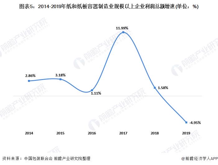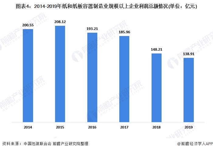 從2015年之后,我國(guó)紙和紙板容器制造業(yè)的利潤(rùn)總額呈下降趨勢(shì)。2019年,我國(guó)紙和紙板容器制造業(yè)規(guī)模以上企業(yè)實(shí)現(xiàn)利潤(rùn)總額138.91億元,同比下降4.95%,為近年來(lái)最大降幅。