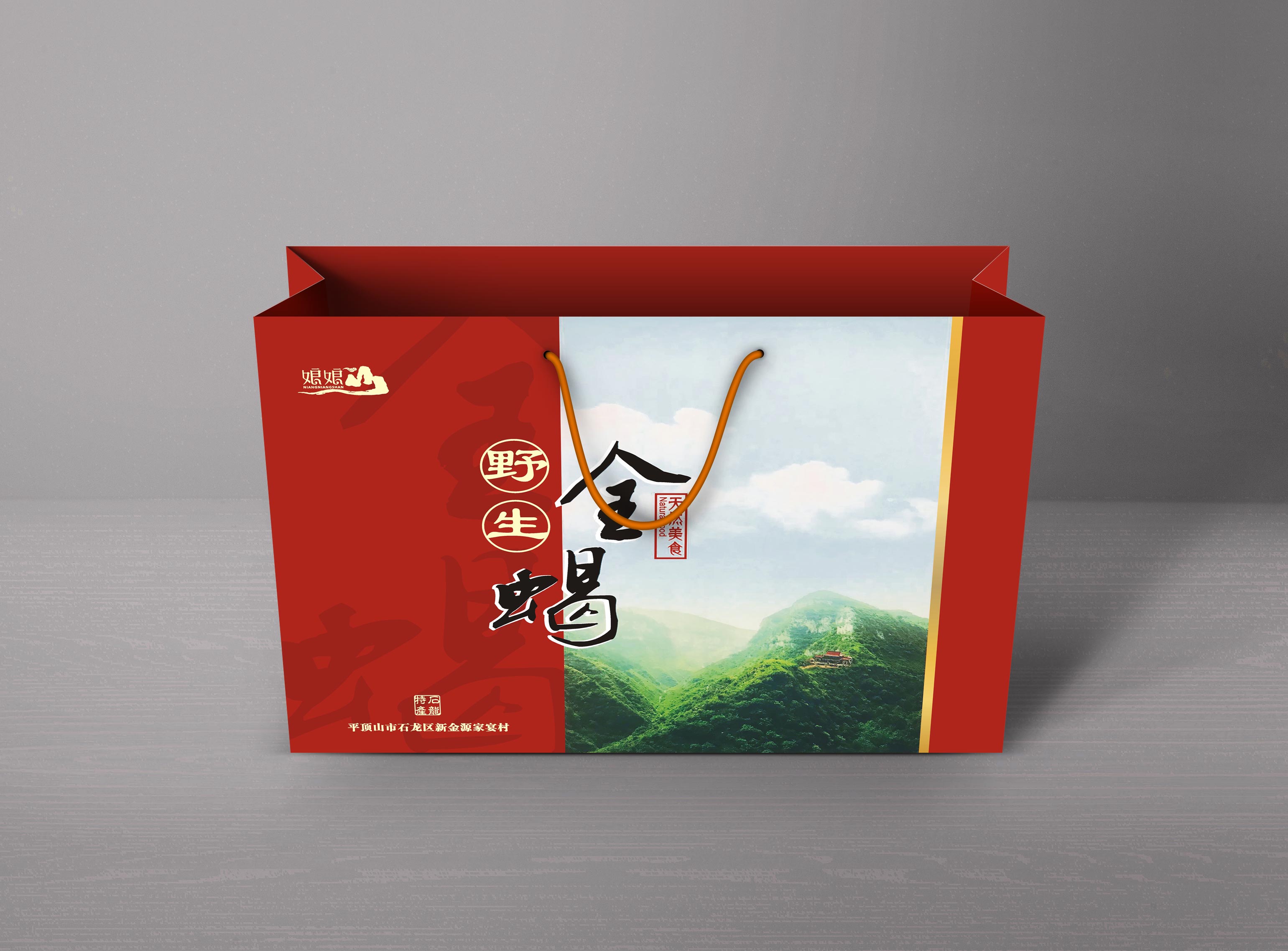 這位客戶的“全蝎”出自娘娘山,故而此包裝設(shè)計元素采用平頂山市石龍區(qū)娘娘山圖片為搭配使其與logo(娘娘山)上下呼應(yīng)。